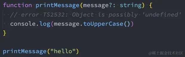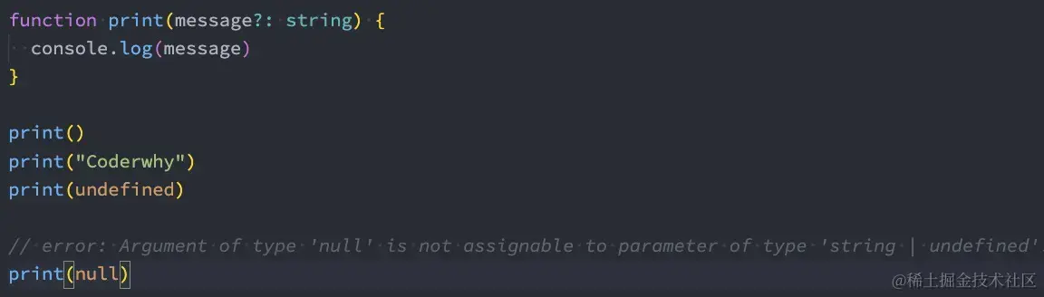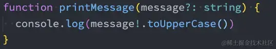 但是,如果我们确定传入的参数是有值的,这个时候我们可以使用非空类型断言。非空断言使用的是 !,表示可以确定某个标识符是有值的,跳过ts在编译阶段对它的检测,这类似swift的强制解包。