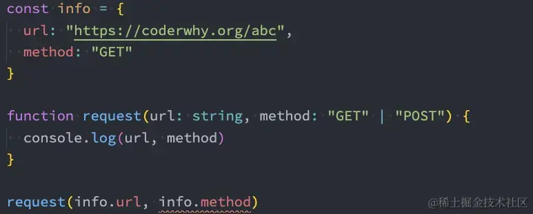 上面代码最后一行会报错,这是因为我们的info对象在进行字面量推理的时候,info.method其实是string类型的,但是request函数的method参数是字面量类型的联合类型,我们没办法将一个string类型赋值给一个字面量类型的联合类型,所以会报错。