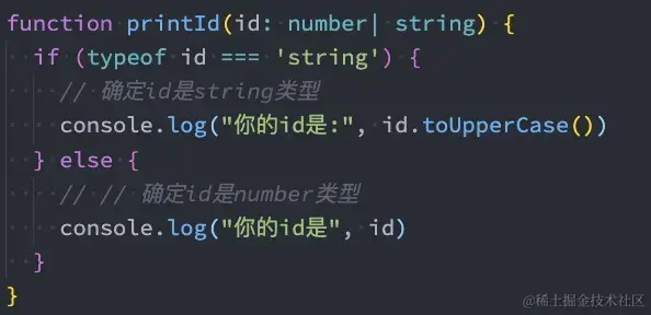 传入给一个联合类型的值是非常简单的,只要保证是联合类型中的某一个类型的值即可。但是我们拿到这个值之后,我们应该如何使用它呢?因为它可能是任何一种类型。比如我们拿到的值可能是string或者number,我们就不能对其调用string上的一些方法,那么我们怎么处理这样的问题呢?