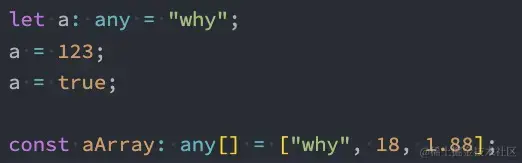 any类型有点像一种讨巧的TypeScript手段,我们可以对any类型的变量进行任何的操作:包括获取不存在的属性、方法,可以给一个any类型的变量赋任何的值,比如数字、字符串的值。