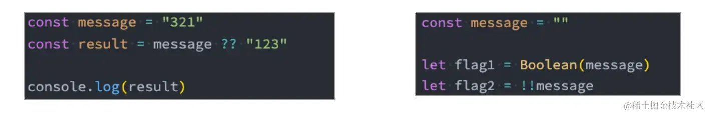 ??:空值合并操作符,它是ES11增加的新特性,当操作符的左侧是 null 或者 undefined 时,返回其右侧操作数,否则返回左侧操作数。和三目运算符有点像,但是比三目运算符更简洁。!!:将一个其他类型转换成boolean类型,类似于Boolean(变量)的方式,其实就是取反两次。