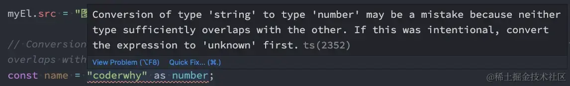 TypeScript只允许类型断言转换为 更具体 或者 不太具体 的类型版本,此规则可防止不可能的强制转换,否则会报错,如下: