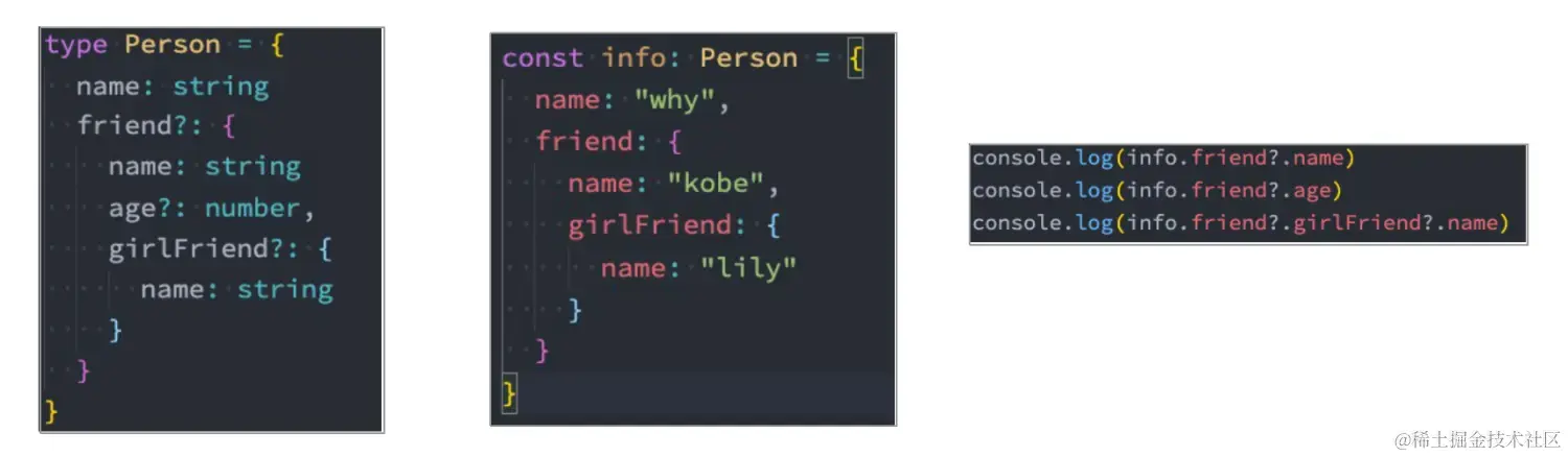 可选链使用可选链操作符 ?. 它的作用是当对象的属性不存在时,会短路,直接返回undefined,如果存在,那么才会继续执行。虽然可选链操作是ECMAScript提出的特性,但是和TypeScript一起使用更般配。