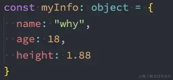 这里我们使用了一个对象来作为类型,在对象中我们可以添加属性,并且告知TypeScript该属性需要是什么类型,属性之间可以使用 , 来分割,每个属性的类型部分是可选的,如果不指定,那么就是any类型。