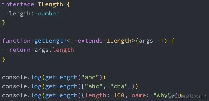 有时候我们希望传入的类型有某些共性,但是这些共性可能不是在同一种类型中,比如string和array都是有length的,或者某些对象也是会有length属性的,那么只要是拥有length的属性都可以作为我们的参数类型,那么应该如何操作呢?在TS中,我们使用<T extends ILength>做泛型约束
