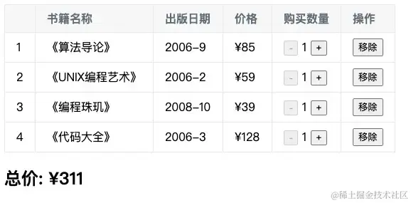 - 点击移除按钮,可以将书籍移除(当所有的书籍移除完毕时,显示购物车为空)