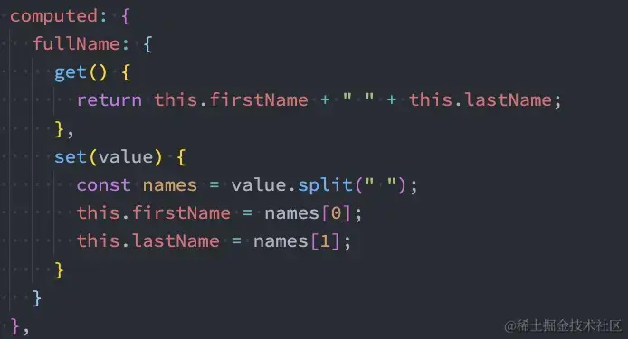 计算属性在大多数情况下,只需要一个getter方法即可,所以我们会将计算属性直接写成一个函数。但是,如果我们确实想设置计算属性的值呢?这个时候我们可以传入一个对象,给计算属性设置一个setter的方法。