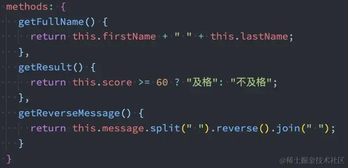 我们有没有什么方法可以将逻辑抽离出去呢? 可以,其中一种方式就是将逻辑抽取到一个method中,放到methods的options中,但是这种做法有一个直观的弊端,就是所有的data使用过程都会变成了一个方法的调用,另外一种方式就是使用计算属性computed。