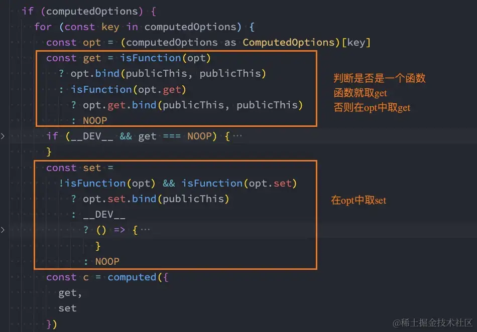 事实上非常的简单,Vue源码内部只是做了一个逻辑判断而已:如果发现是个函数,那肯定是计算属性,直接取getter就行,如果是个对象,那就是对象里面有setter、getter,就取对象里面的getter。
