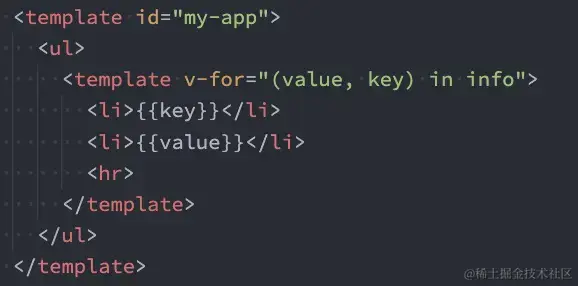 类似于v-if,你可以使用 template 元素来循环渲染一段包含多个元素的内容。 我们使用template来对多个元素进行包裹,而不是使用div来完成,因为div会被渲染,template不会被渲染。而且如果有ul,ul里面不推荐放div,只推荐放li。