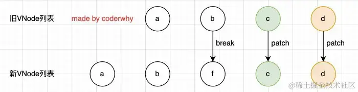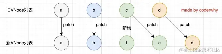 我们会发现上面的diff算法效率并不高,c和d来说它们事实上并不需要有任何的改动,但是因为我们的c被f所使用了,所有后续所有的内容都要一次进行改动,并且最后进行新增。