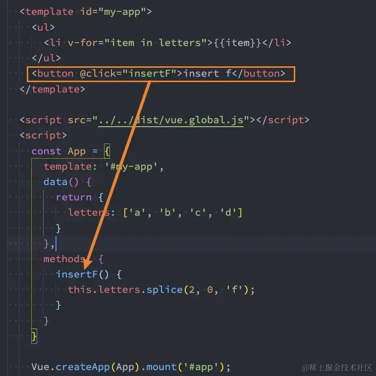 我们可以确定的是,这次更新对于ul和button是不需要进行更新,需要更新的是我们li的列表。在Vue中,对于相同父元素的子元素节点并不会重新渲染整个列表,因为对于列表中 a、b、c、d它们都是没有变化的。在操作真实DOM的时候,我们只需要在中间插入一个f的li即可。