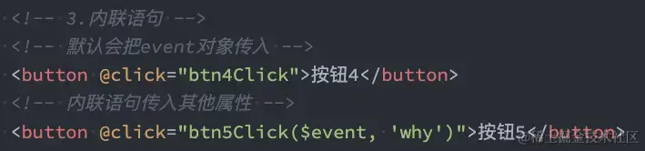 - 如果需要同时传入某个参数和event时,可以通过$event传入事件,并且方法的实现必须按顺序写明参数。