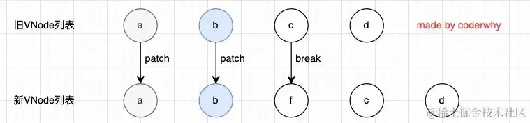 - 最后,如果旧节点大于新节点,就删除旧结点,如果旧节点小于新节点,那就新增节点