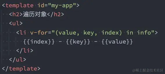 v-for也支持遍历对象,并且支持有3个参数: 一个参数:"value in object" 二个参数:"(value, key) in object" 三个参数:"(value, key, index) in object"