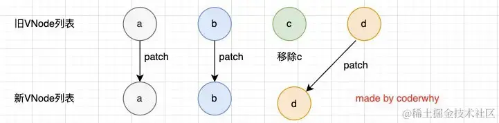- 第四步是如果新的节点遍历完毕,但是依然有旧的节点,那么就移除旧节点: