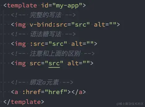 v-bind有一个对应的语法糖,也就是简写方式,在开发中,我们通常会使用语法糖的形式,因为更简洁。