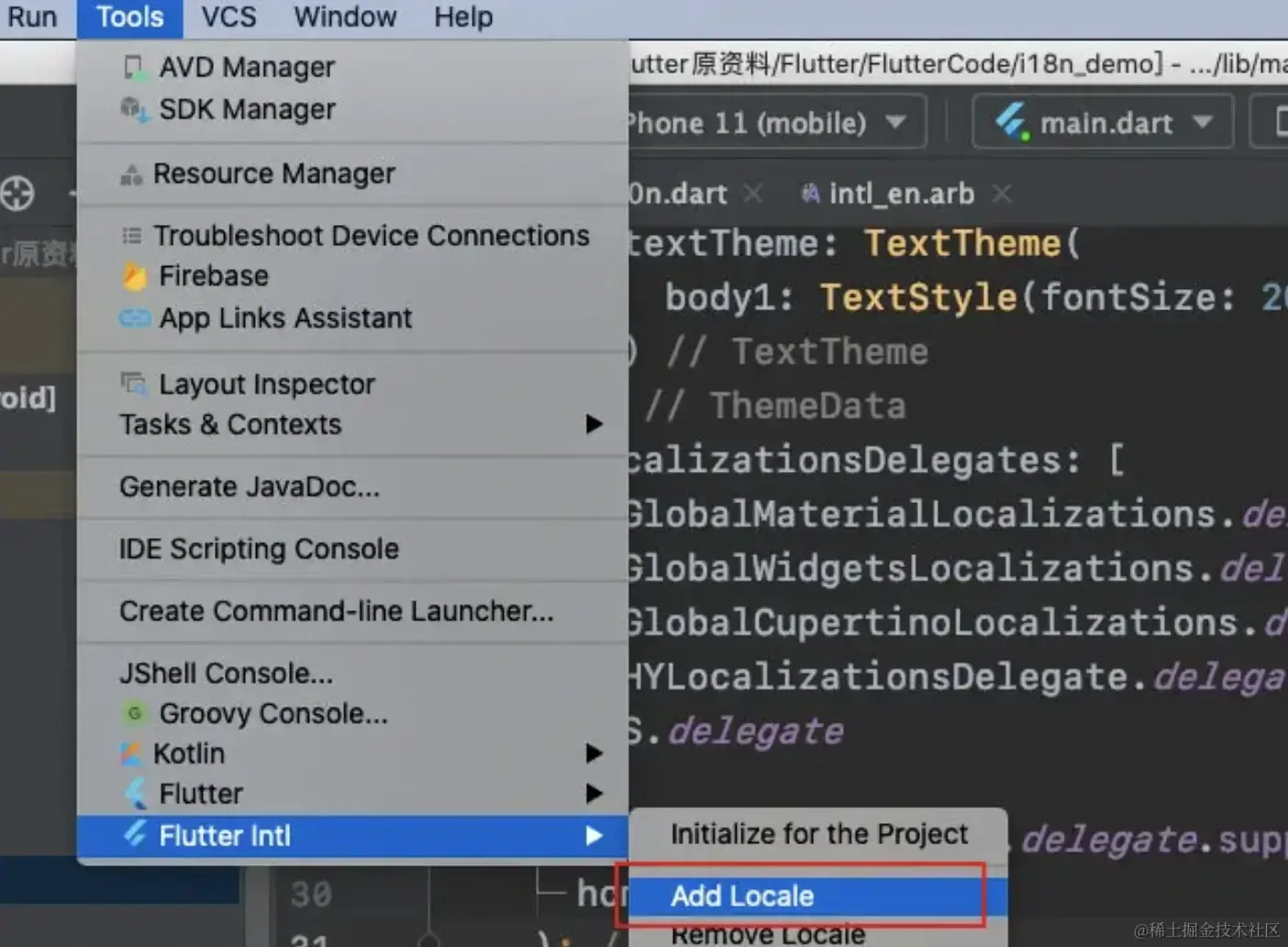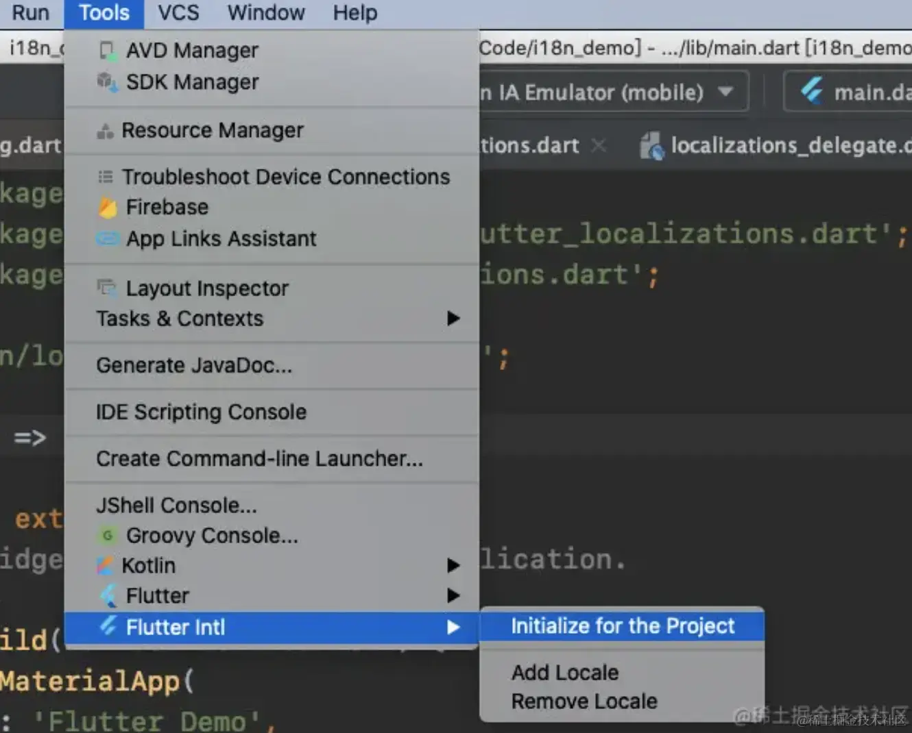 选择工具栏Tools - Flutter Intl - Initialize for the Project