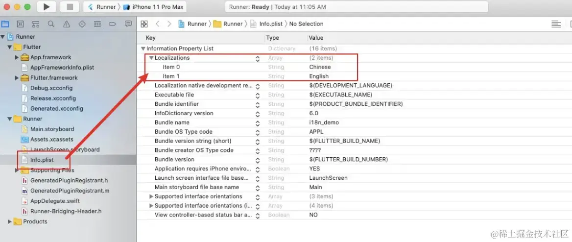 - 元数据的设置在iOS项目中对应的info.plist文件中;