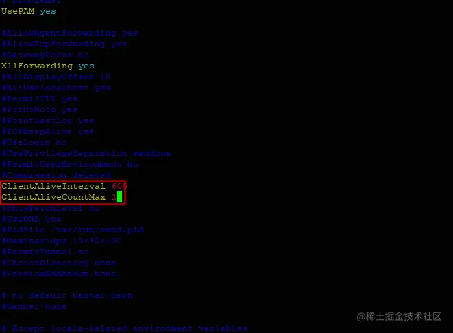 编辑/etc/ssh/sshd_config,将ClientAliveInterval 设置为300到900,即5-15分钟,将ClientAliveCountMax设置为0-3之间。