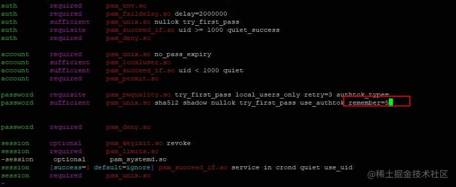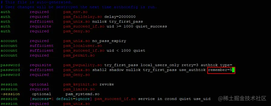 在/etc/pam.d/password-auth和/etc/pam.d/system-auth中password sufficient pam_unix.so 这行的末尾配置remember参数为5-24之间,原来的内容不用更改,只在末尾加了remember=5。