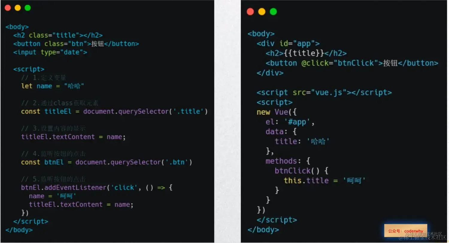 - 右边代码: 声明式编程,我只是告诉h2标签中我需要显示title,当title发生改变的时候,通过一些机制自动来更新状态;