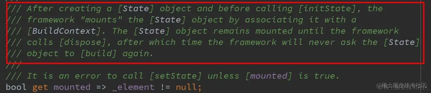 - mounted是State内部设置的一个属性,事实上我们不了解它也可以,但是如果你想深入了解它,会对State的机制理解更加清晰;