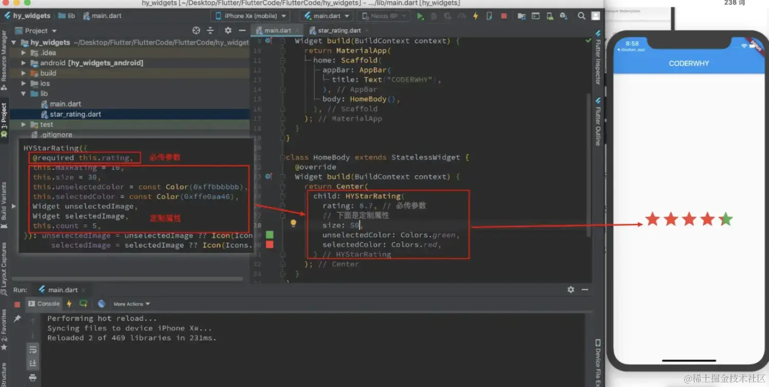 rating:必传参数,告诉Widget当前的评分;maxRating:可选参数,最高评分,根据它来计算一个比例,默认值为10;size:星星的大小,决定每一个star的大小;unselectedColor:未选中星星的颜色(该属性是使用默认的star才有效);selectedColor:选中星星的颜色(该属性也是使用默认的star才有效);unselectedImage:定制未选中的star;selectedImage:定义选中时的star;count:展示星星的个数;
