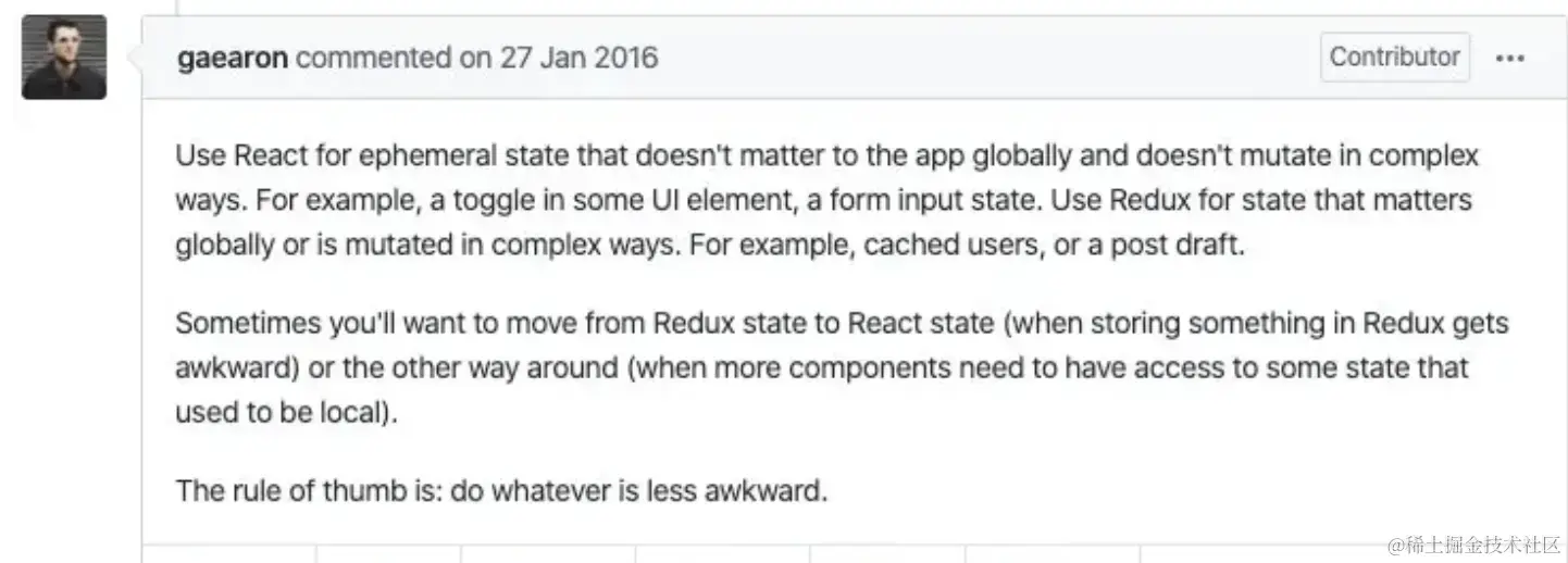 针对React使用setState还是Redux中的Store来管理状态哪个更好的问题,Redux的issue上,Redux的作者Dan Abramov,它这样回答的: