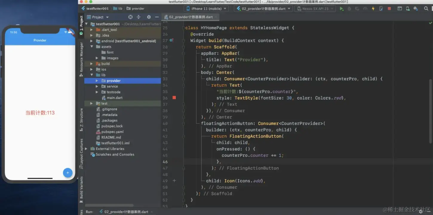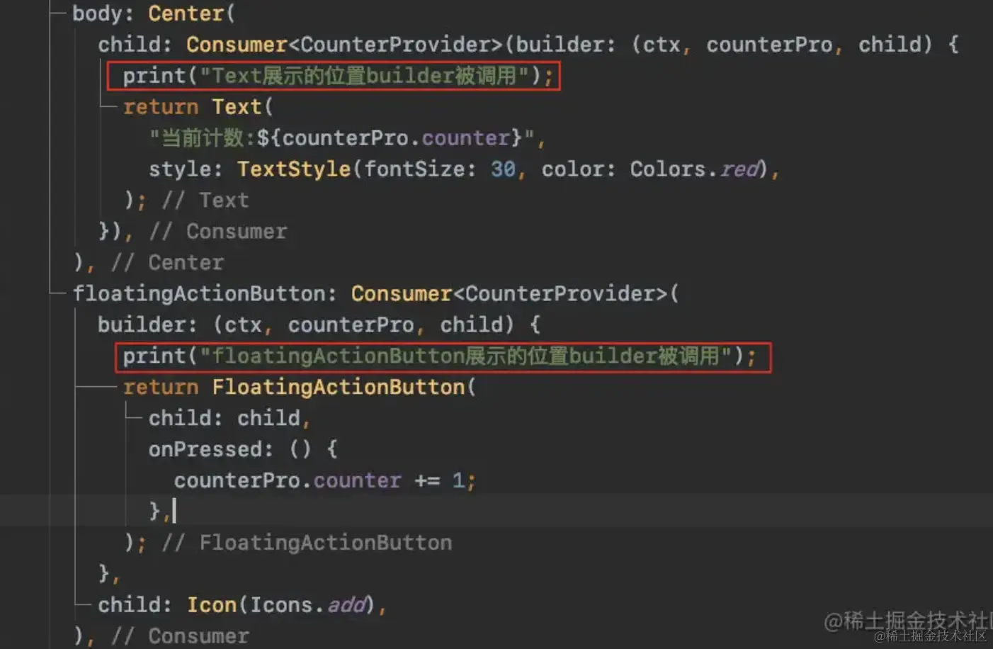 - 引入位置一:在body中使用Consumer,Consumer需要传入一个builder回调函数,当数据发生变化时,就会通知依赖数据的Consumer重新调用builder方法来构建(这样就不会调用整个Widget的build方法,节省了性能)。