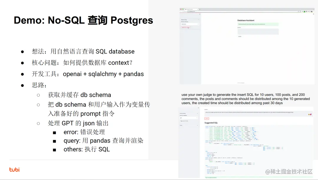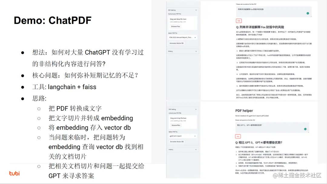 其中 database assistant/PDF helper 这类的工具实践,尤其让我印象深刻。我们在 ChatGPT 等火热话题下,焦虑的一个点是 AI 是否会取代自己的工作。如果不去实践思考,我觉得未来肯定是会被 AI 替代自己的工作的。而陈老师亲自动手实践的小工具,不仅体现了超强的执行力,还将 AI 的生产力真正融入如何让 AI 帮助我们提高效率上来。