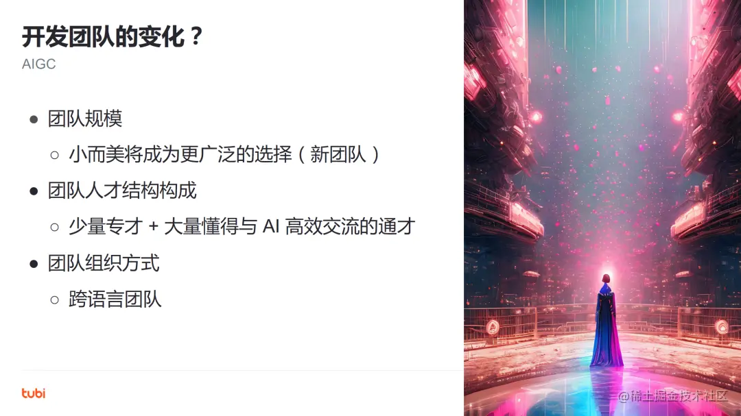陈天老师还总结了 AIGC 对开发团队的组织方式、开发流程的影响,对我从工程师转型为技术型的 Team Leader 也很有启发。
