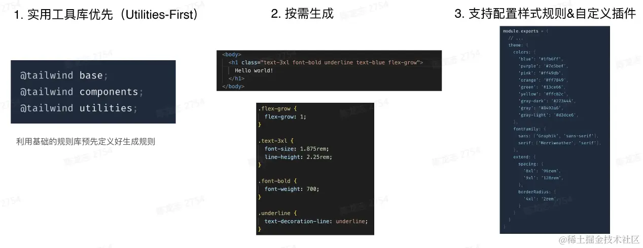 - 原子化CSS: 是一种CSS的架构方式,它倾向于小巧且用途单一的class,并以视觉效果进行命名