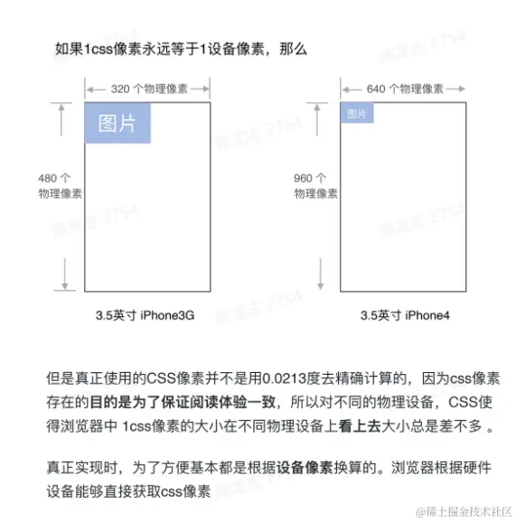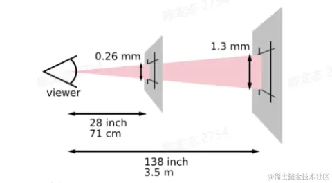 - CSS像素: 其实是一个视角单位。规范给出的定义是,1css像素是从一臂之遥解析度为96DPI(即1英寸96点)的设备输出时,1点(即1/96英寸)的视角