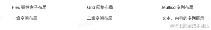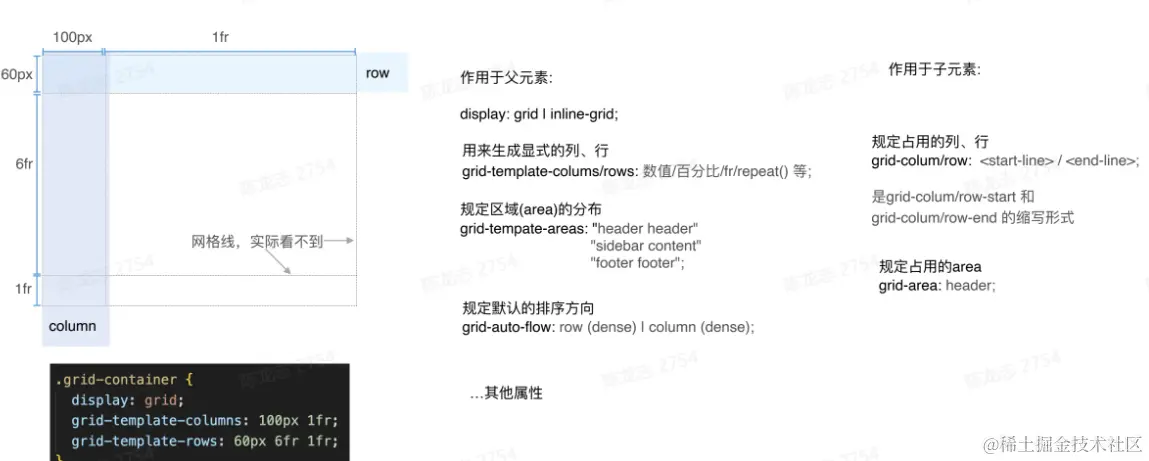 - 网格布局: Grid布局,可以定义由行和列组成的二维布局,然后将元素放置到网格中。元素可以只占其中一个单元格,也可以占据多行或多列