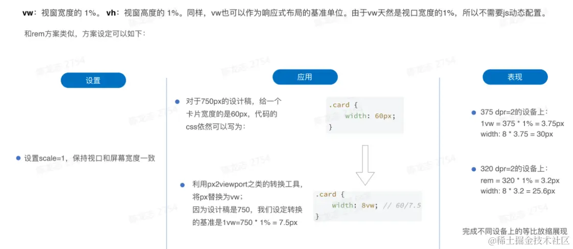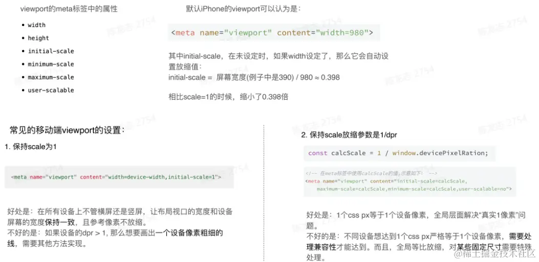 - 移动端的viewport: 布局视口(viewport)是页面html元素(根元素)的包含块,默认情况下,window.document.documentElement.clientWidth就是viewport的宽度。在移动设备中,默认的布局视口由于历史兼容pc屏幕的原因,并不符合需求,我们经常需要用标签对viewport进行设定,来完成移动端设备的适配