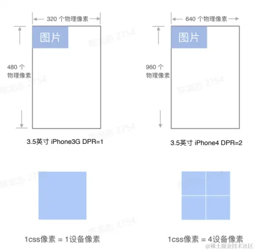 - 设备像素: 显示器上绘制的最小单位,显示屏通过控制每个像素点的颜色,使屏幕显示出不同的图像;设备像素和设备相关,屏幕从工厂出来那天起,它上面的物理像素点就固定不变了