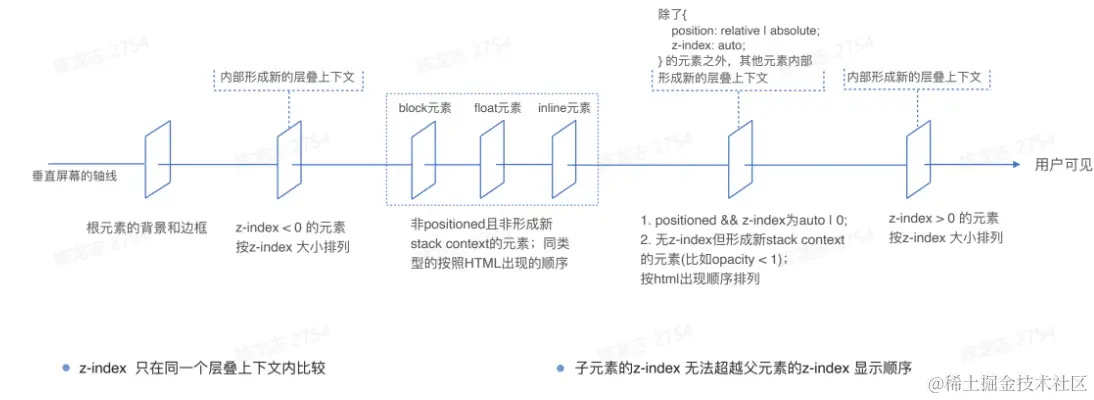 - 层叠顺序: 层叠顺序不仅指不同的层叠上下文的顺序,同一个层叠上下文内,元素间也有顺序