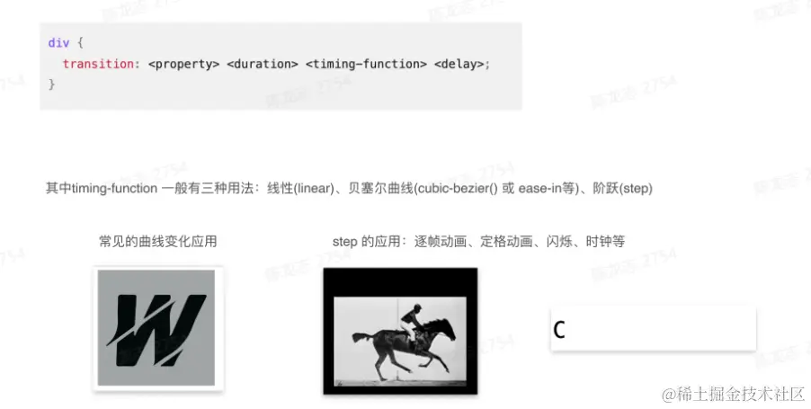 - transform过渡: 通过指定某些元素属性从一种起始状态,在一段时间内以某种变化节奏,过渡到终止状态