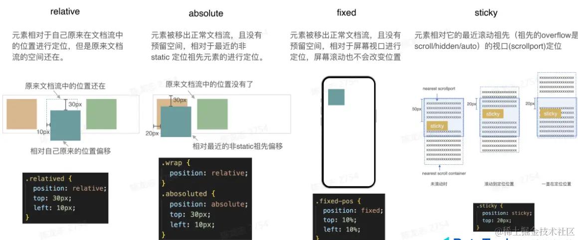 - 定位Position: 为了我们可以在文档流的基础上,让元素移动,做出更多灵活的改变,当position属性的取值非static的时候,可以使用top,right,bottom,left对其进行定位