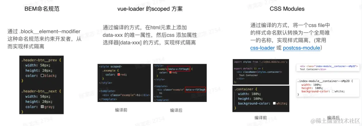 - CSS模块化: css Module就是为了解决全局污染问题出现的方案,解决CSS全局污染,本质上是保证样式集合对应的选择器是唯一的,从这个角度看,主流的单纯针对于防止全局污染的方案大概有: