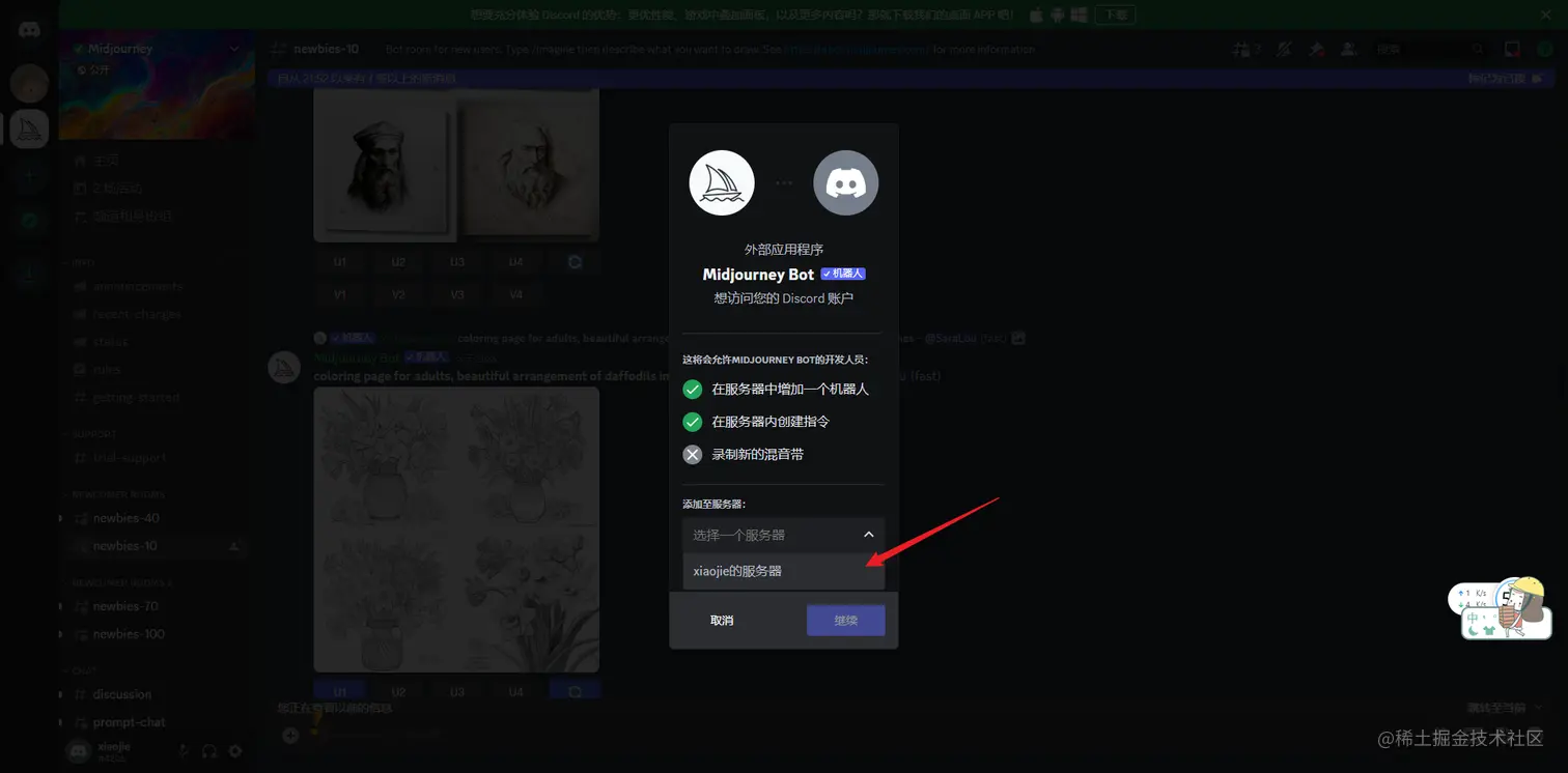 选择需要添加midjourney的服务器,依次点击“继续”,“授权”