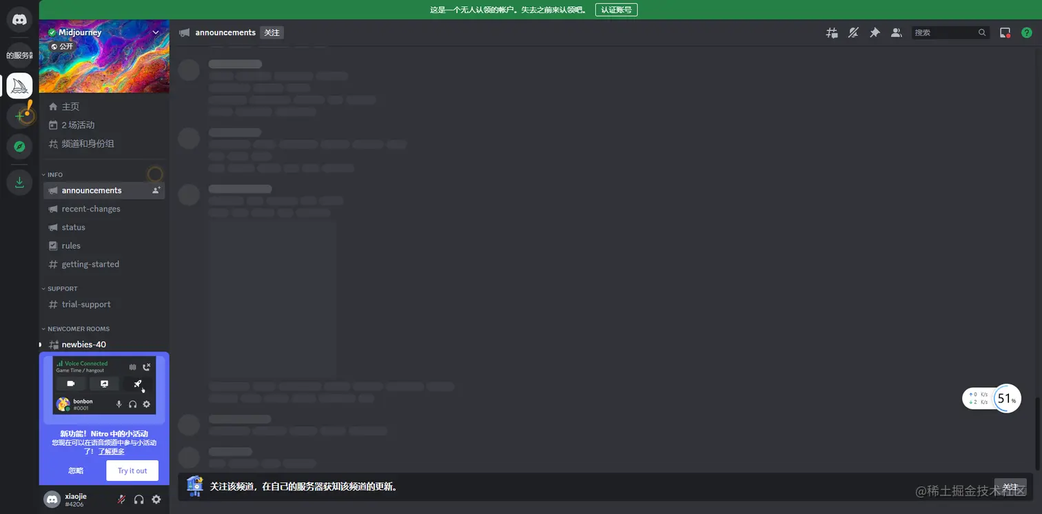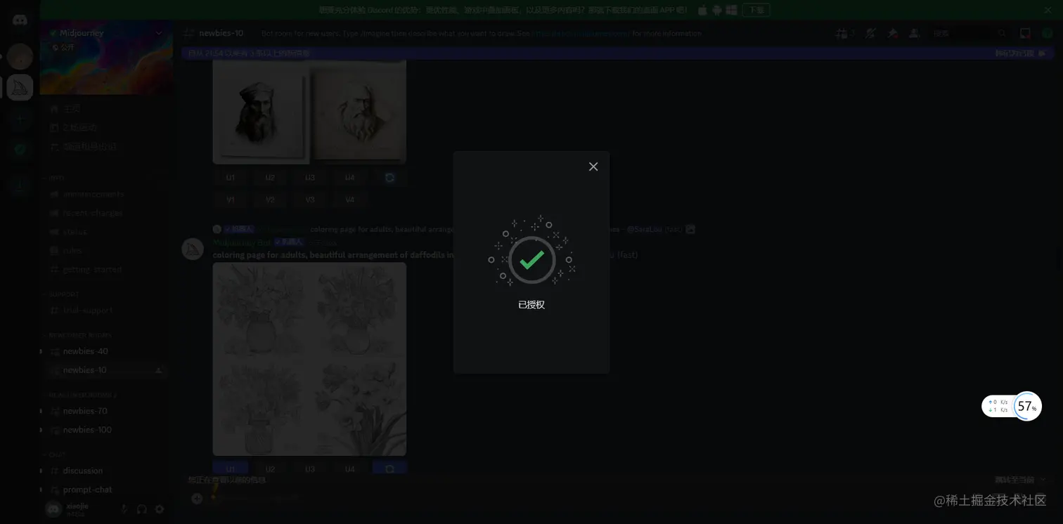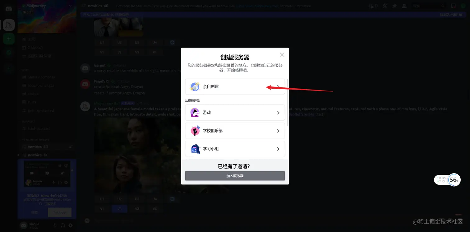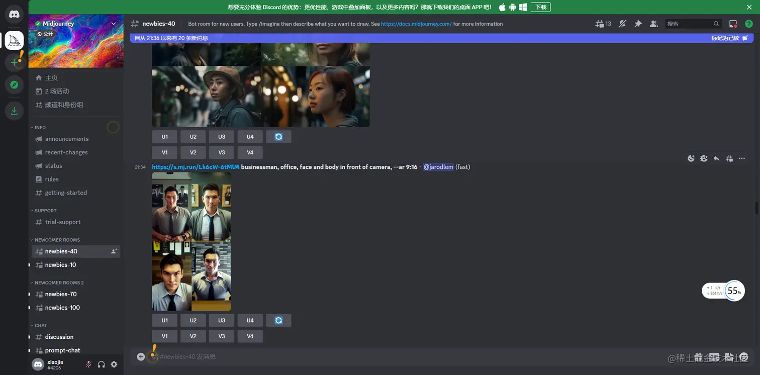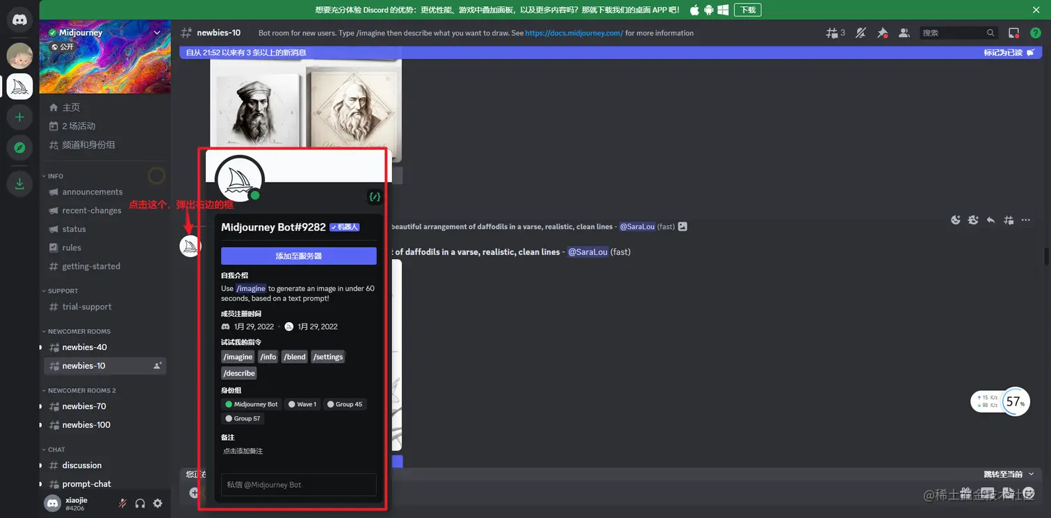在输入框可以输入一些命令去生成图片,这里是公开的频道,可以看到好多别人生成的图片。如果有需要的话,最好自己新建一个频道,这样就有一个自己的“独立世界”了,只有自己生成的图片。