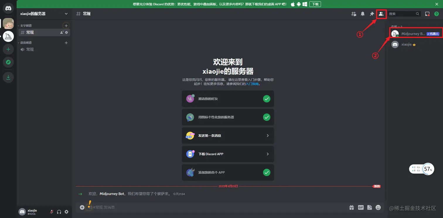 进入自己的服务器,点击右上角“个人(①)”图标,就可以看到,midjourney(②)已经被添加到我们的服务器了