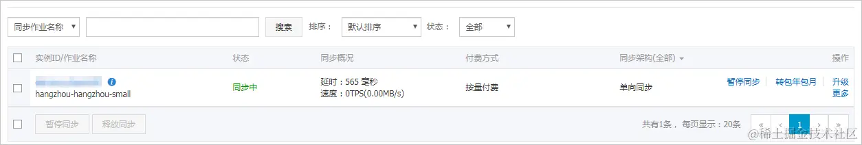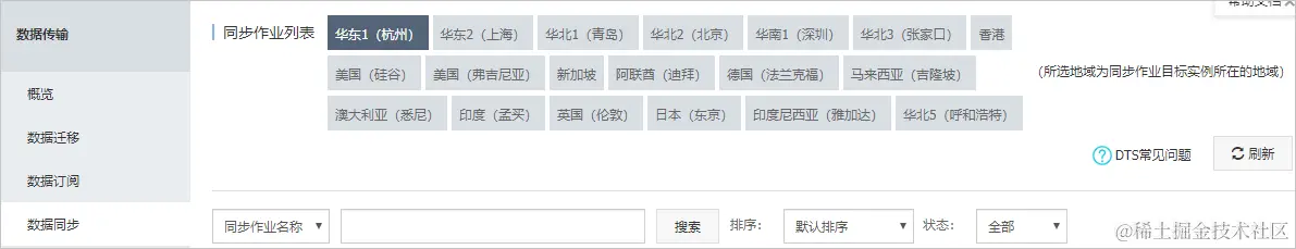在同步作业列表页面顶部,选择同步的目标实例所属地域