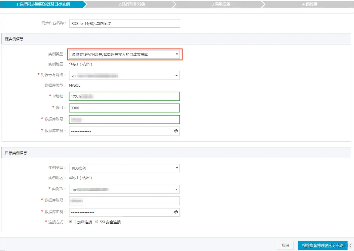 类别 配置 说明 无 同步作业名称 DTS会自动生成一个同步作业名称,建议配置具有业务意义的名称(无唯一性要求),便于后续识别 源实例信息 实例类型 选择通过专线/VPN网关/智能网关接入的自建数据库 实例地区 购买数据同步实例时选择的源实例地域信息,不可变更 对端专有网络 选择自建数据库接入的VPC ID 数据库类型 购买数据同步实例时选择的数据库类型:MySQL,不可变更 IP地址 填入自建MySQL数据库的服务器IP地址 端口 填入自建MySQL数据库的服务端口,默认为3306 数据库账号 填入自建MySQL的数据库账号,需要具备Replication slave、Replication client、show view及所有同步对象的Select权限 数据库密码 填入该数据库账号对应的密码 目标实例信息 实例类型 选择RDS实例 实例地区 购买数据同步实例时选择的目标实例地域信息,不可变更 实例ID 选择作为数据同步目标的RDS实例ID 数据库账号 填入目标RDS的数据库账号 数据库密码 填入该数据库账号对应的密码 连接方式 根据需求选择非加密连接或SSL安全连接。如果设置为SSL安全连接,您需要提前开启RDS实例的SSL加密功能,详情请参见设置SSL加密