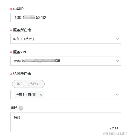 内网IP:输入属于100.64.0.0/10 子网段的云服务IP地址或地址段。例如:100.118.28.52/32。