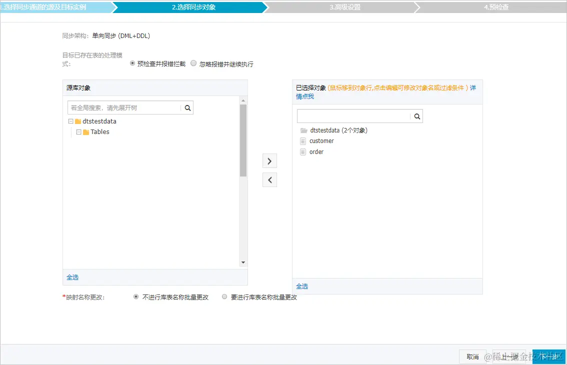 此步骤会将源实例中已经存在同步对象的结构及数据在目标实例中初始化,作为后续增量同步数据的基线数据。