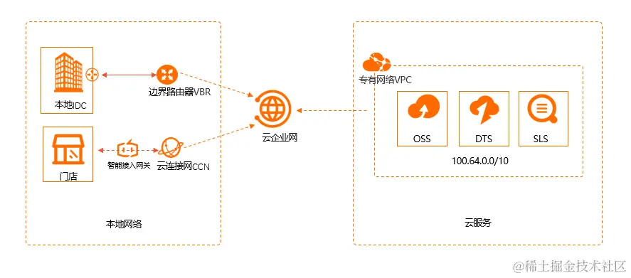 云服务指使用阿里云云服务地址段100.64.0.0/10提供服务的云产品,例如对象存储(OSS)、日志服务(SLS)、数据传输服务(DTS)等。在VPC、VBR或CCN加载到同一个云企业网实例后,您的本地网络可以通过云企业网访问部署在VPC中的云服务
