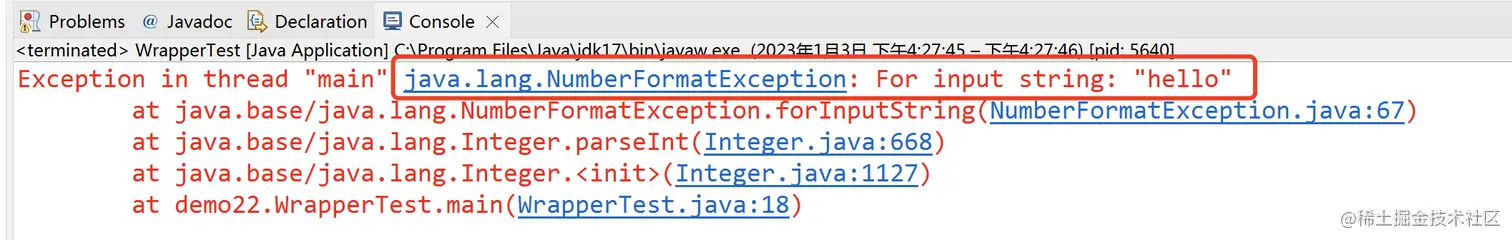 但是我们要注意,在将字符串转为Integer或Double等类型时,并不是所有的字符串内容都可以转换成功,有可能会出现NumberFormatException异常,如下所示: